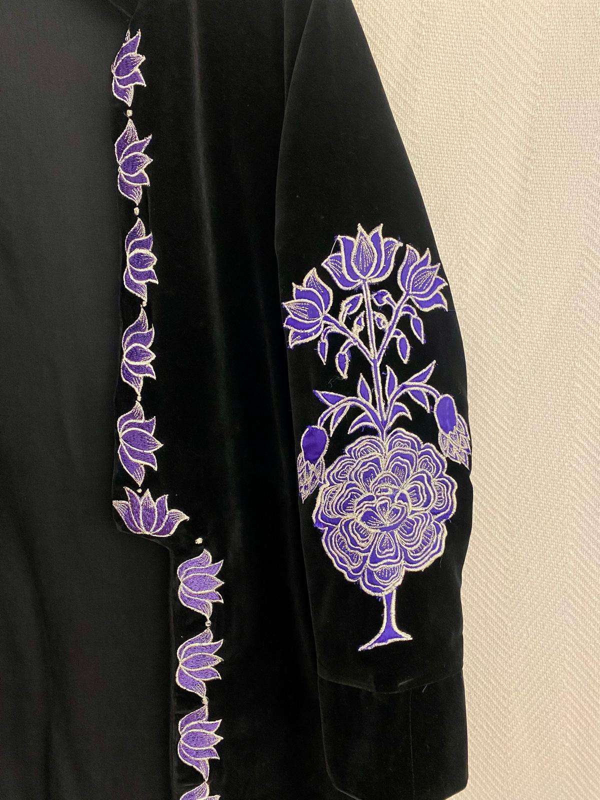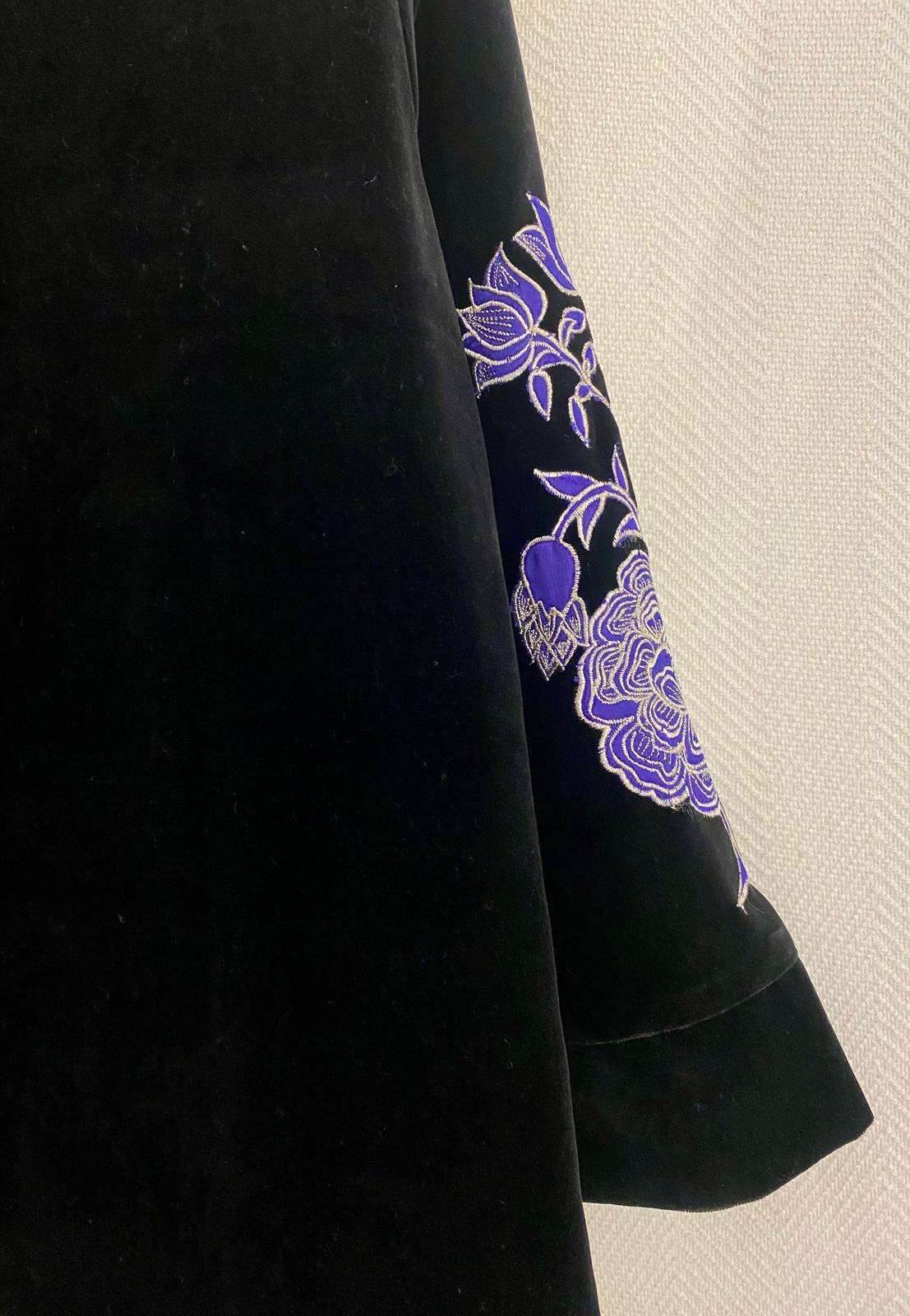 Chaqueta de terciopelo negra, abierta y con detalles bordados en violeta.