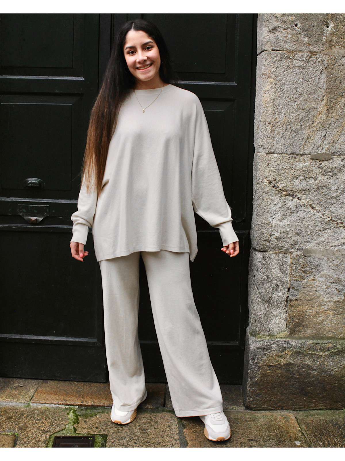 Conjunto pantalon y jersey de punto suave con cuello redondo